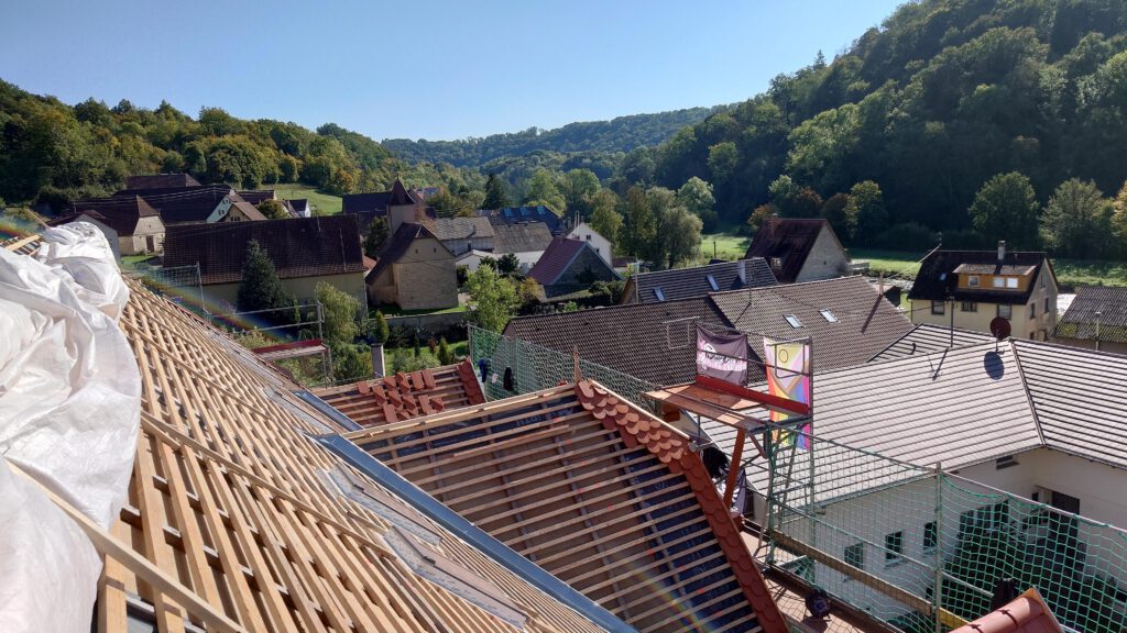Voraussichtlich werden wir Mitte November das Dach abschließen und erst mal in eine Winterpause gehen, da wir aufgrund des Wetters die Fassade ins nächste Jahr verschoben haben.